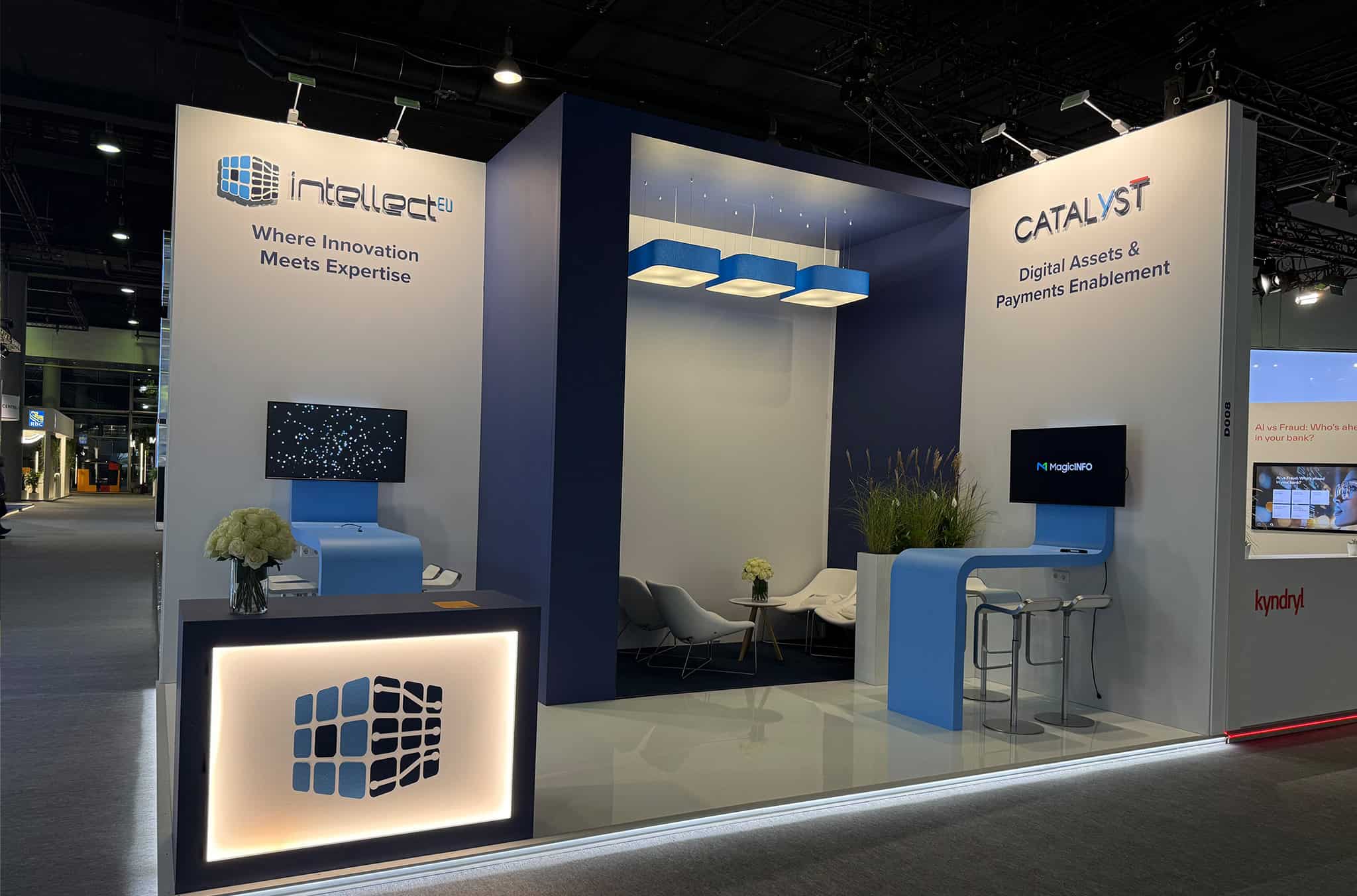 Functionality was a key consideration. Two waterfall tables, each equipped with a TV screen, served as focal points for product demonstrations and visual presentations. These stations were positioned to draw attention without disrupting the open flow of the space, allowing for engaging interactions without creating bottlenecks.